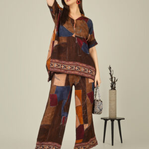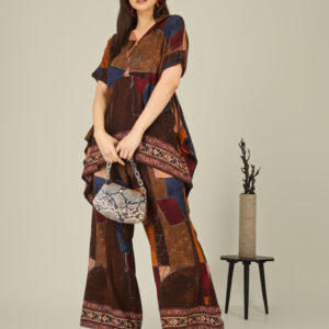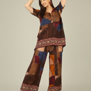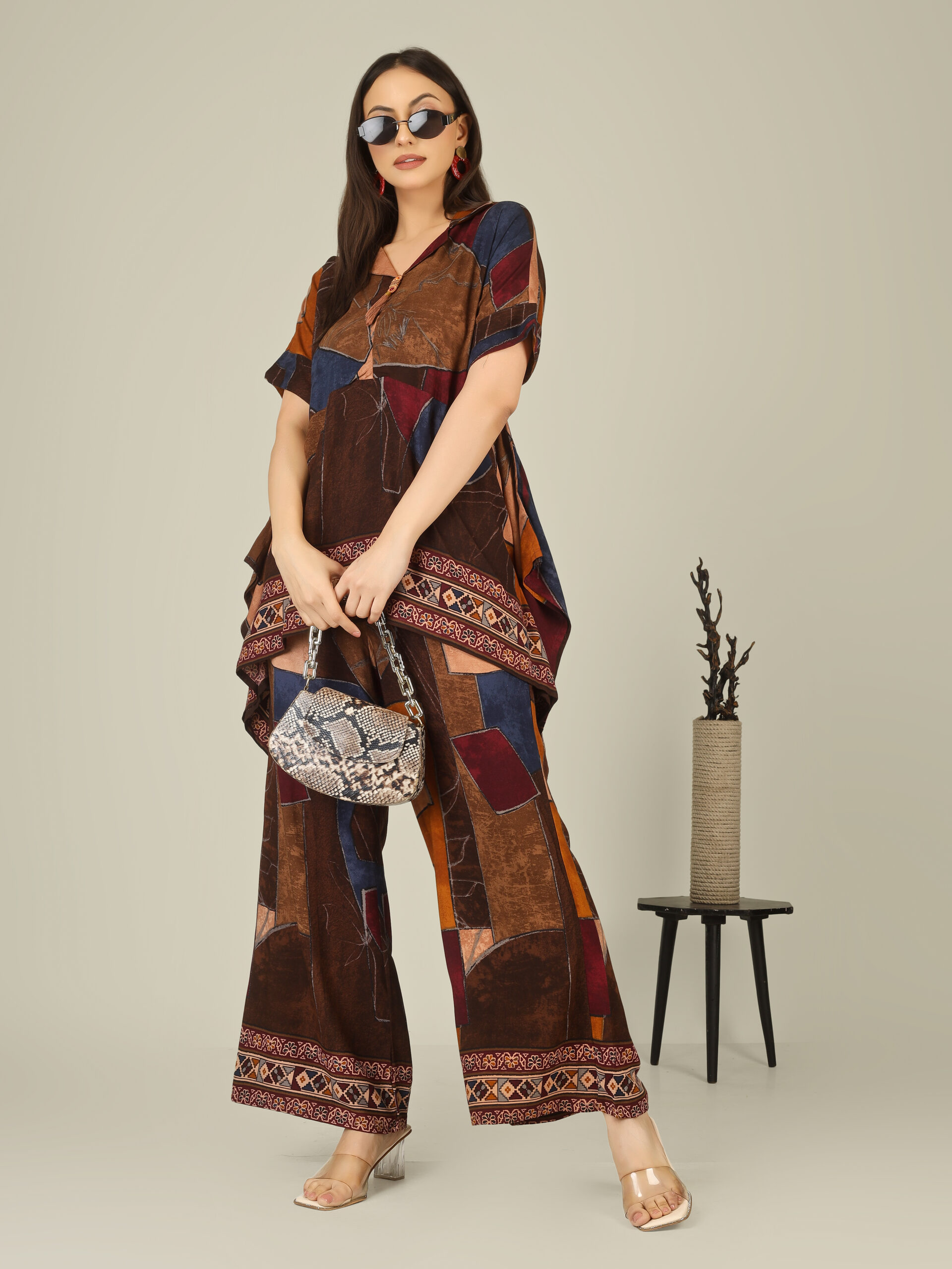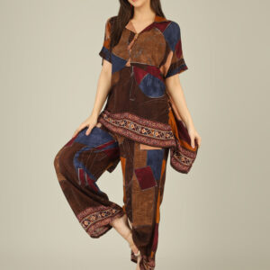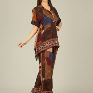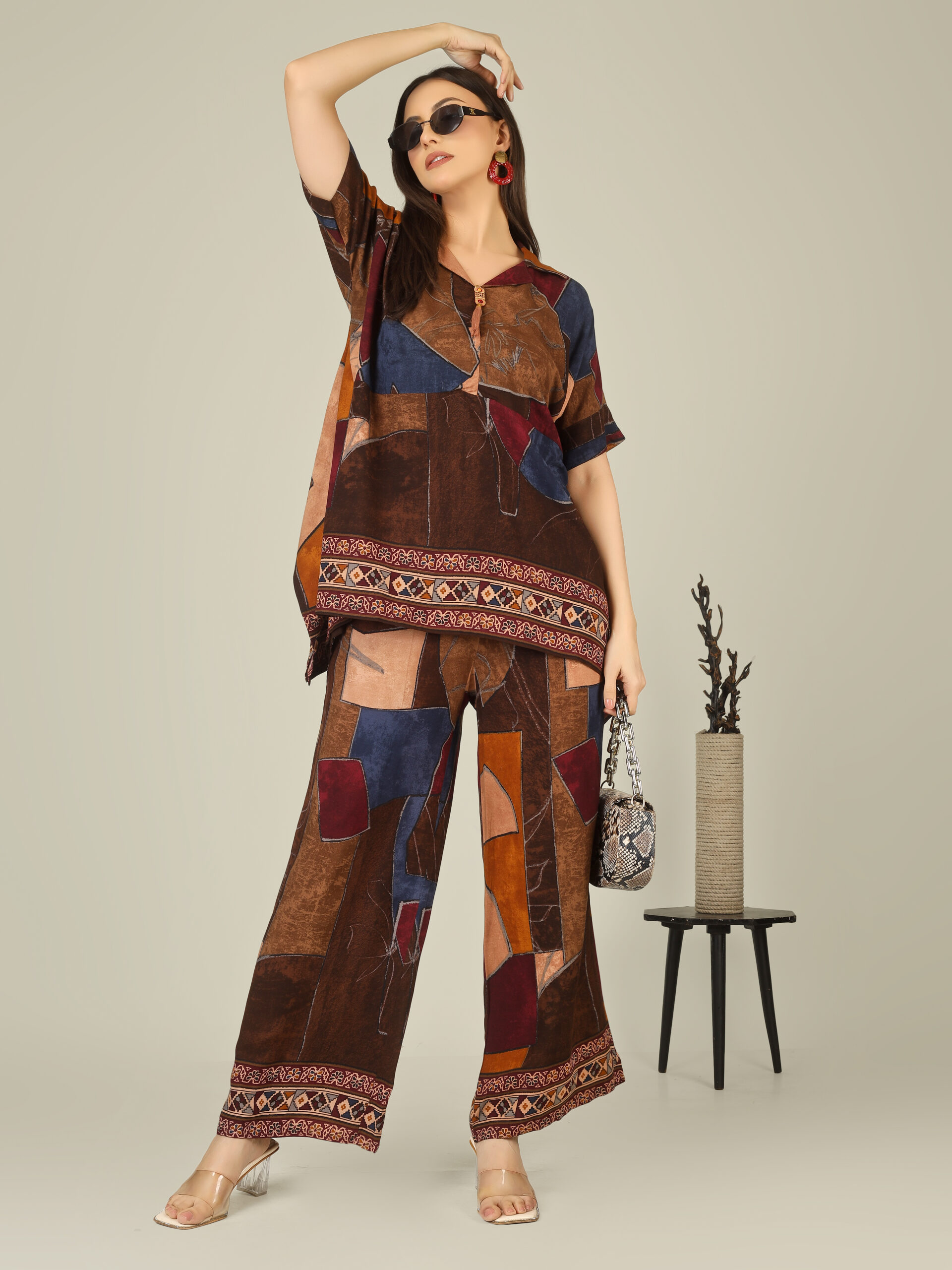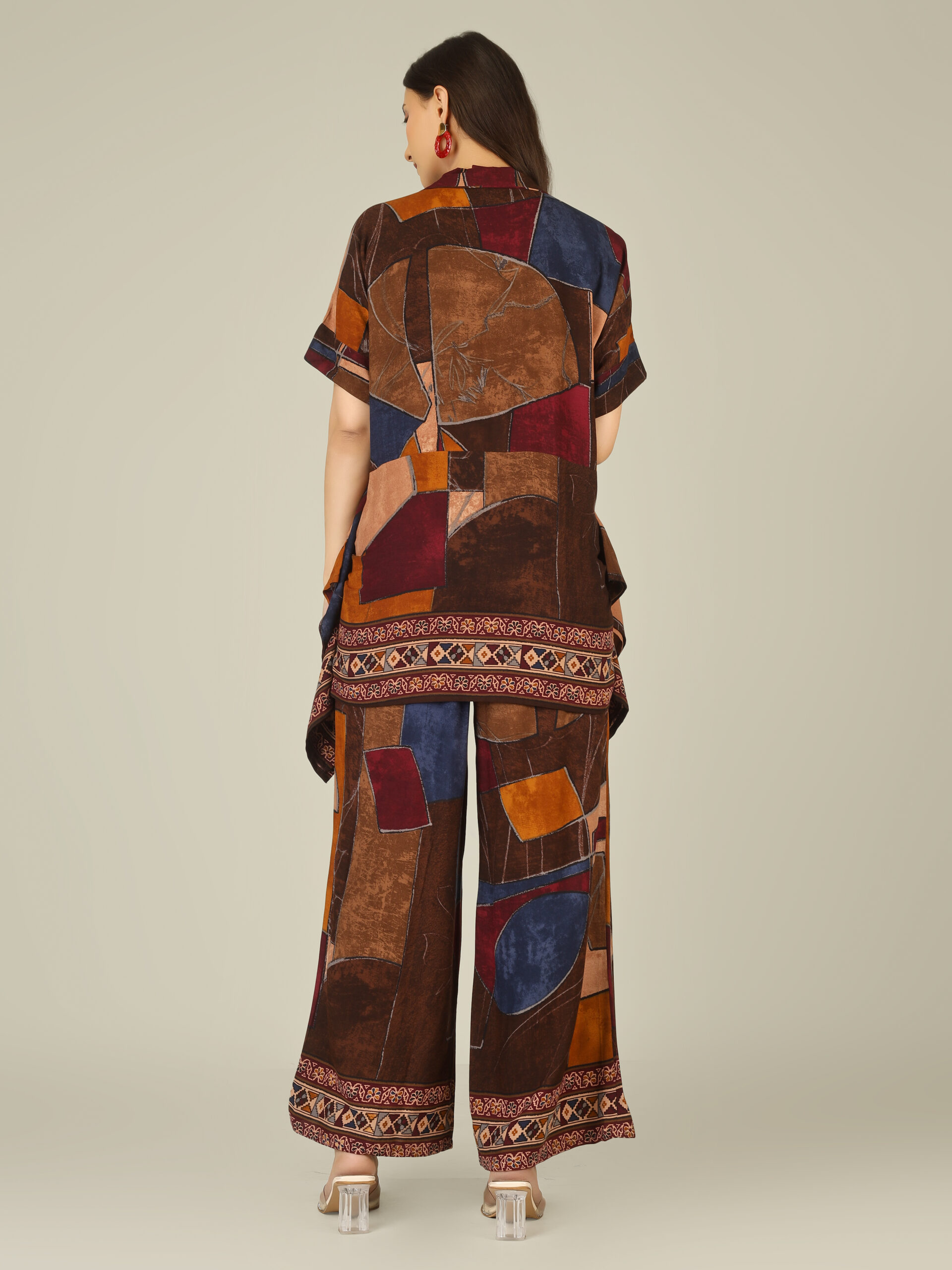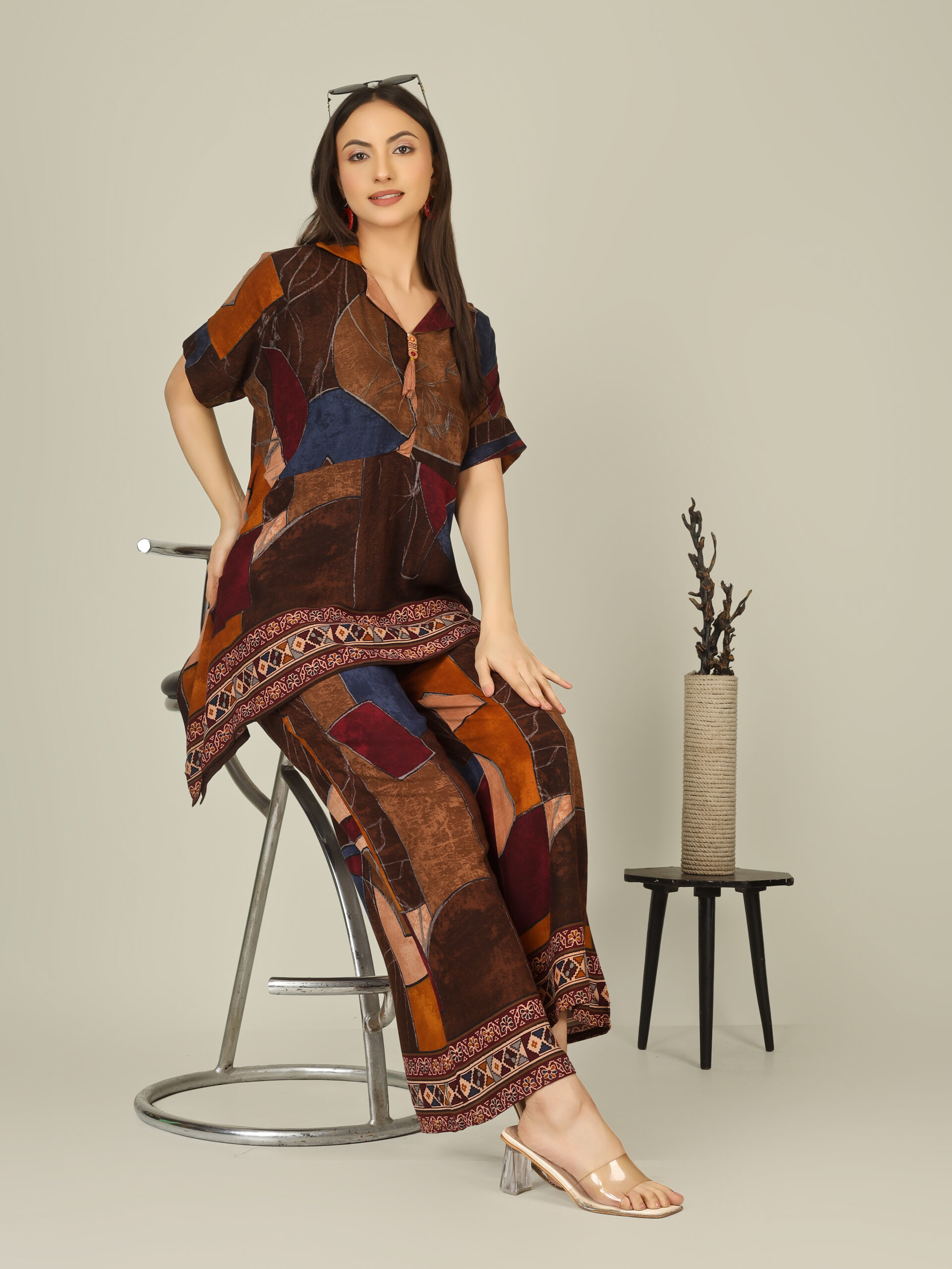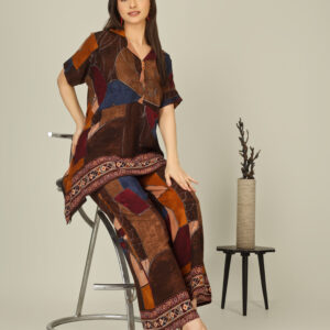 This BROWN MOSAIC CO-ORD SET blends artistic expression with a modern, relaxed silhouette. Featuring a bold geometric print that covers both pieces, the ensemble is designed for effortless style and all-day comfort.