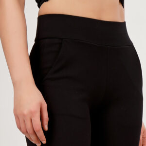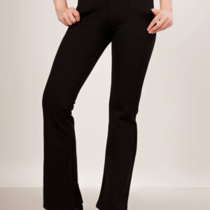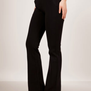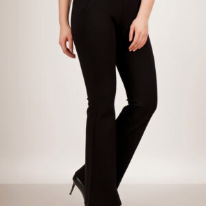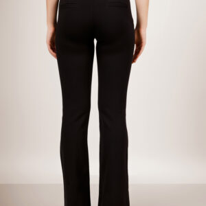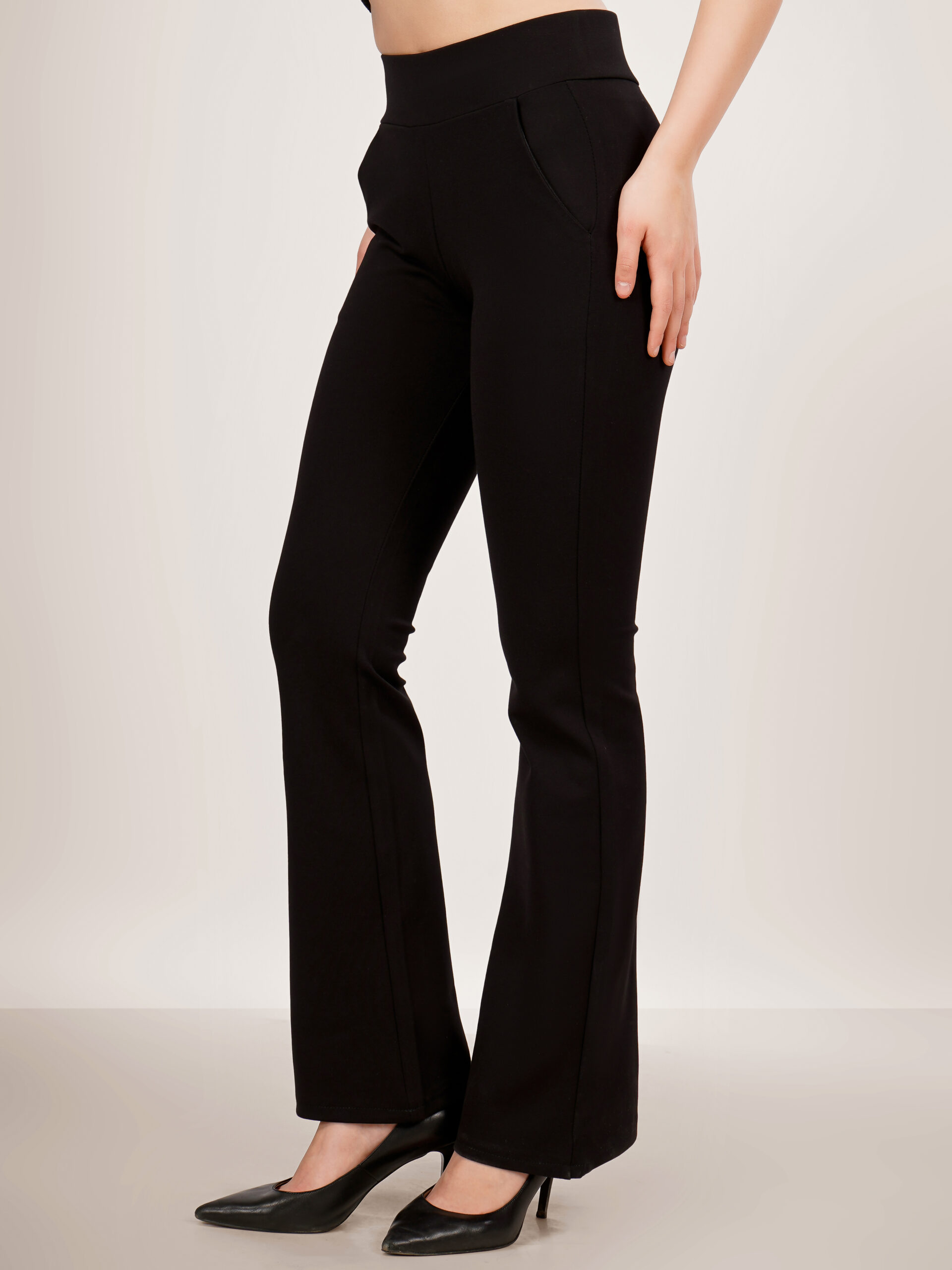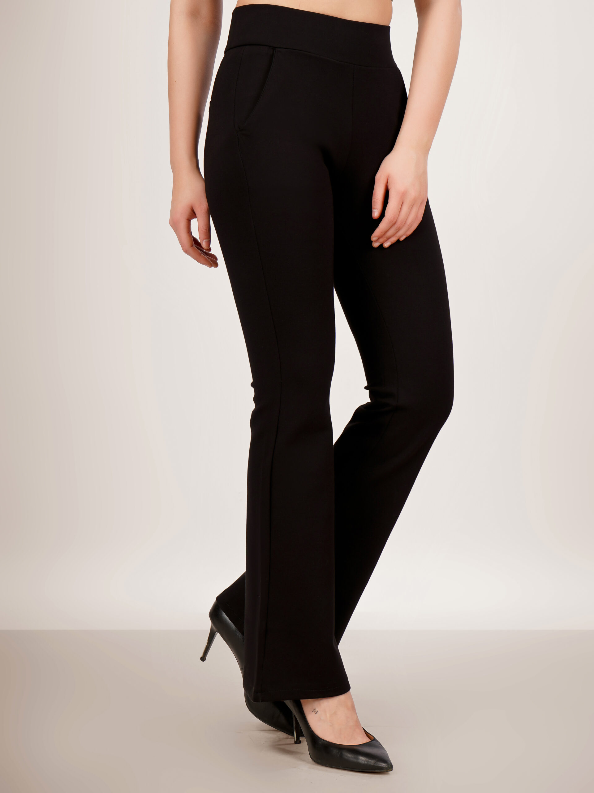 These high-waisted black jeggings feature a bootcut/flare silhouette, blending the professional look of formal trousers with the stretch and comfort of leggings.