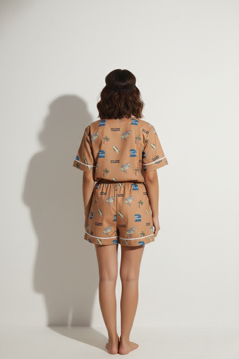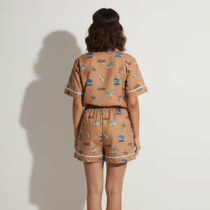The set features a tailored, short-sleeved button-down top with sophisticated contrast piping along the lapels and cuffs, paired with matching high-waisted shorts that boast a relaxed, movement-friendly fit. Adorned with a playful, surf-inspired motif—complete with palm trees and retro graphics—it captures a nostalgic coastal vibe. To ensure your beauty sleep remains uninterrupted, the look is topped off with a matching eye mask, making it a complete sanctuary in garment form. Whether you’re lounging or dreaming, this co-ord brings a curated, editorial edge to your private sanctuary.